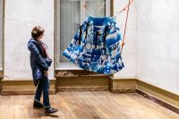 cyanotypes, impressions numériques, tissus, ouatine, satin, passementeries, rubans, franges